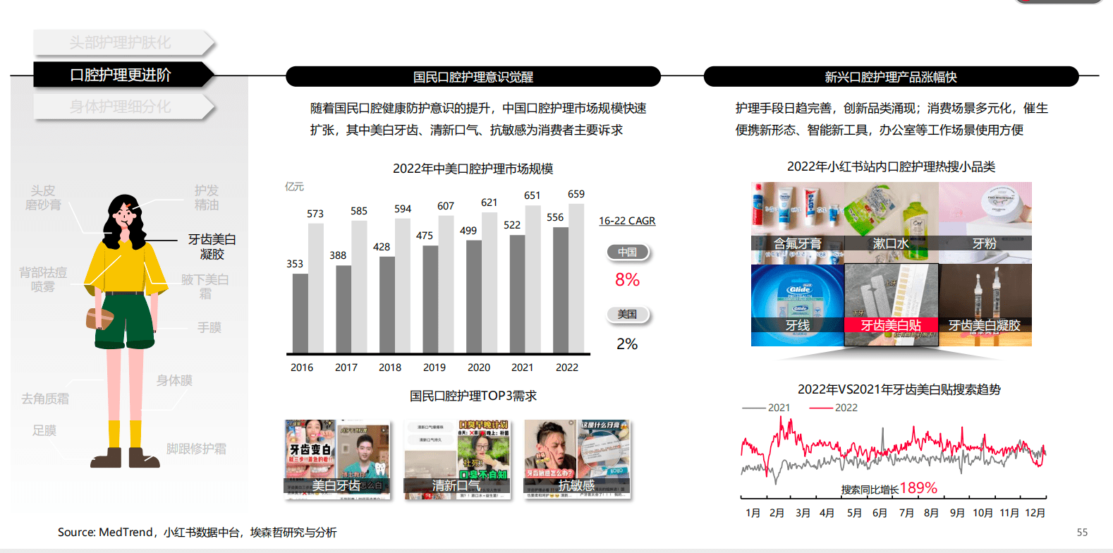 比如头发护理中,头皮和头发的护理分开,头皮精华/干发喷雾增长迅速,头皮修护/抗老进阶需求增速迅猛。口腔护理中,冲牙器、美白贴等新品类增速很快,根据「趋势报告」数据,2022年站内美白牙贴相关搜索同比增长189%,用户也会更关注这些工具使用方法。